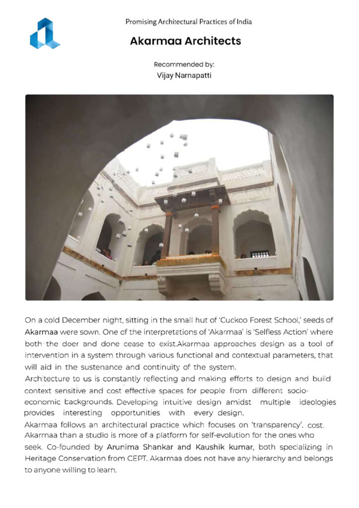 Akarmaa believes in sustainable practices for newly built spaces and of the old spaces that have shown resilience through time. Akarmaa also believes in the process of doing while constantly reflecting and making efforts to design, restore and build context sensitive, cost-effective spaces for people from different socio-economic backgrounds; and approach conservation with an intent to preserve values that need to be carried forward from the past while introducing aspects to support modern functional needs.