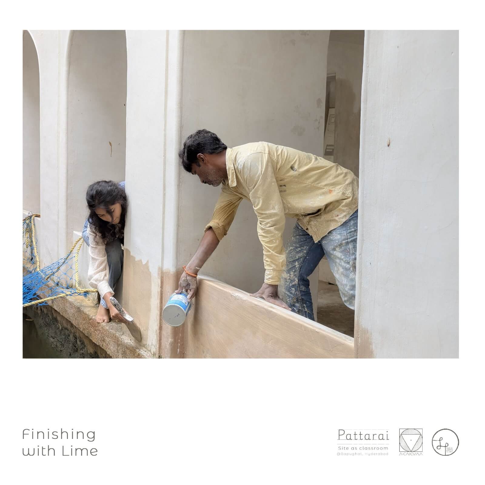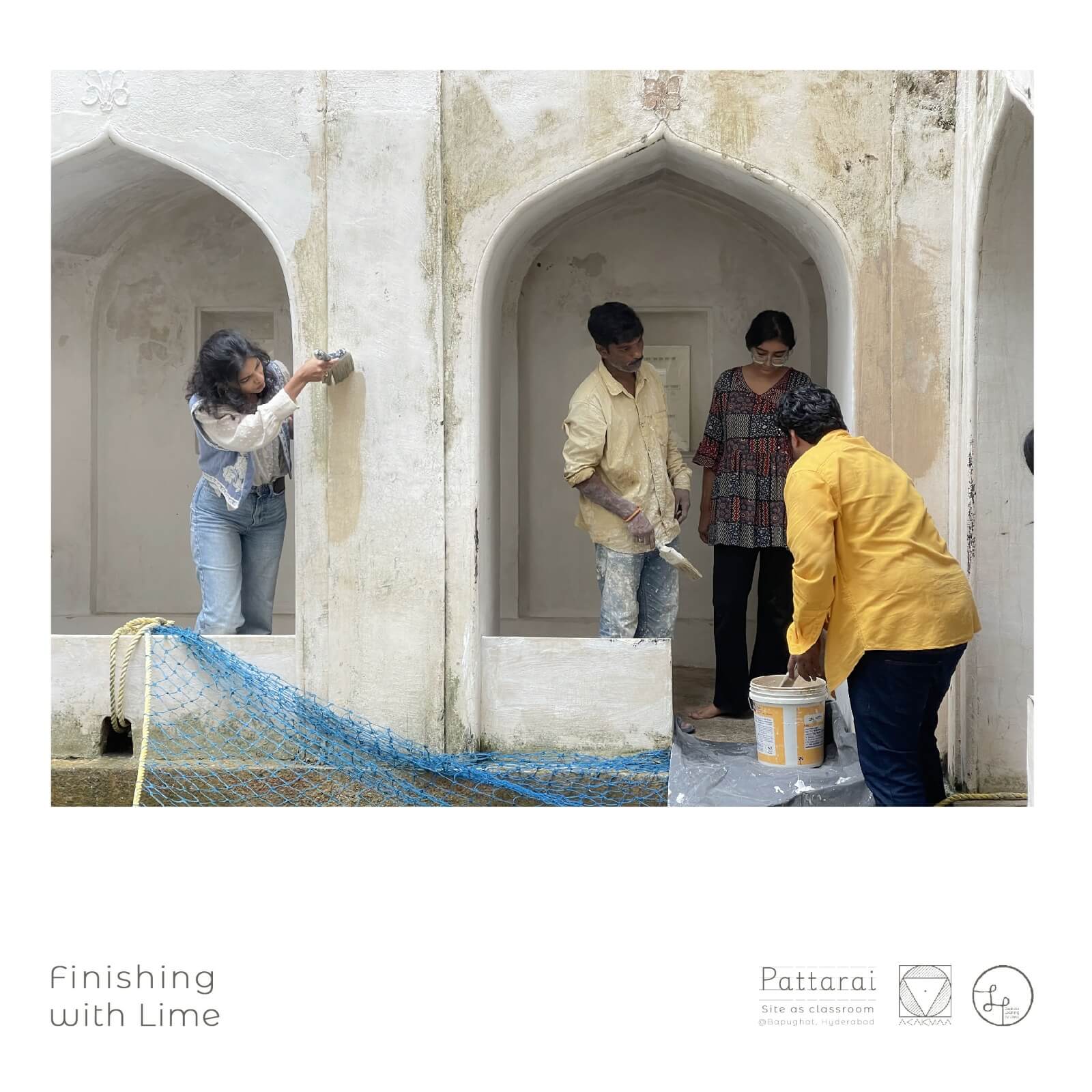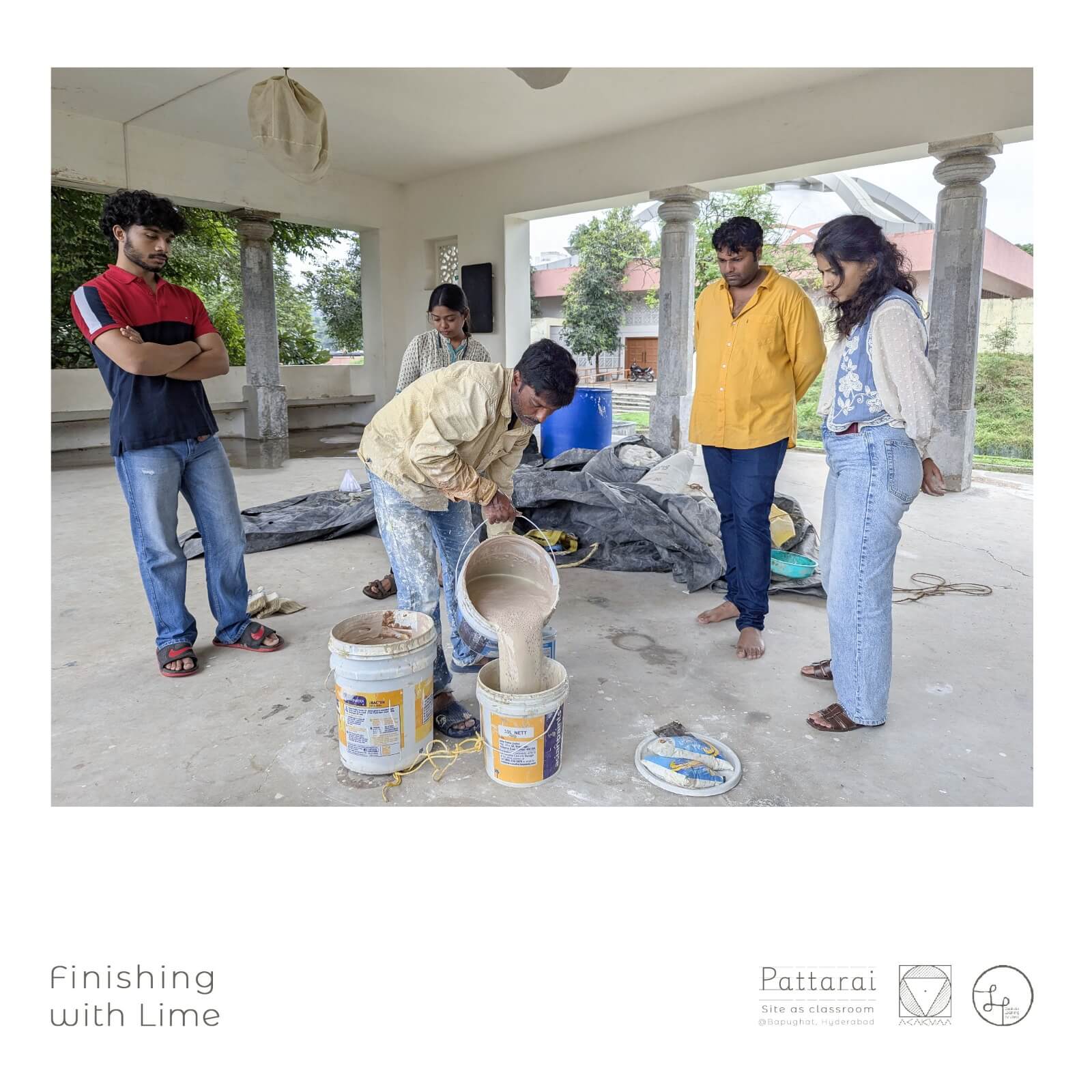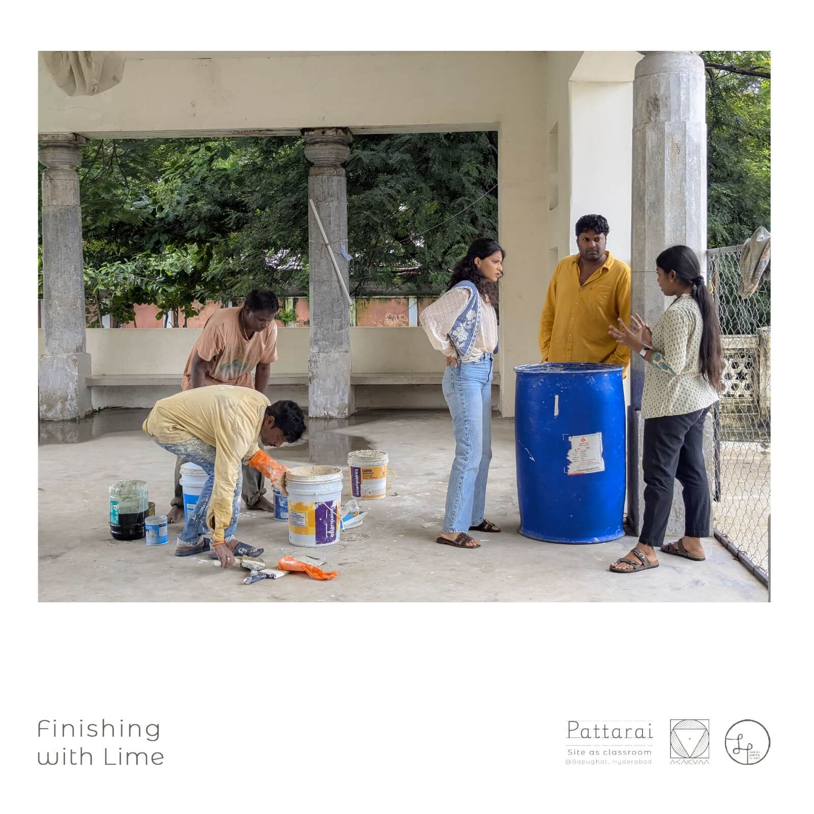 The process of using lime as a final coat was discussed. The participants witnessed the mixing of slaked lime with other adhesive materials in their respective proportions. “It’s very interesting to see how natural material like kadukkai can add such pigment to the lime,” said one of the participants.