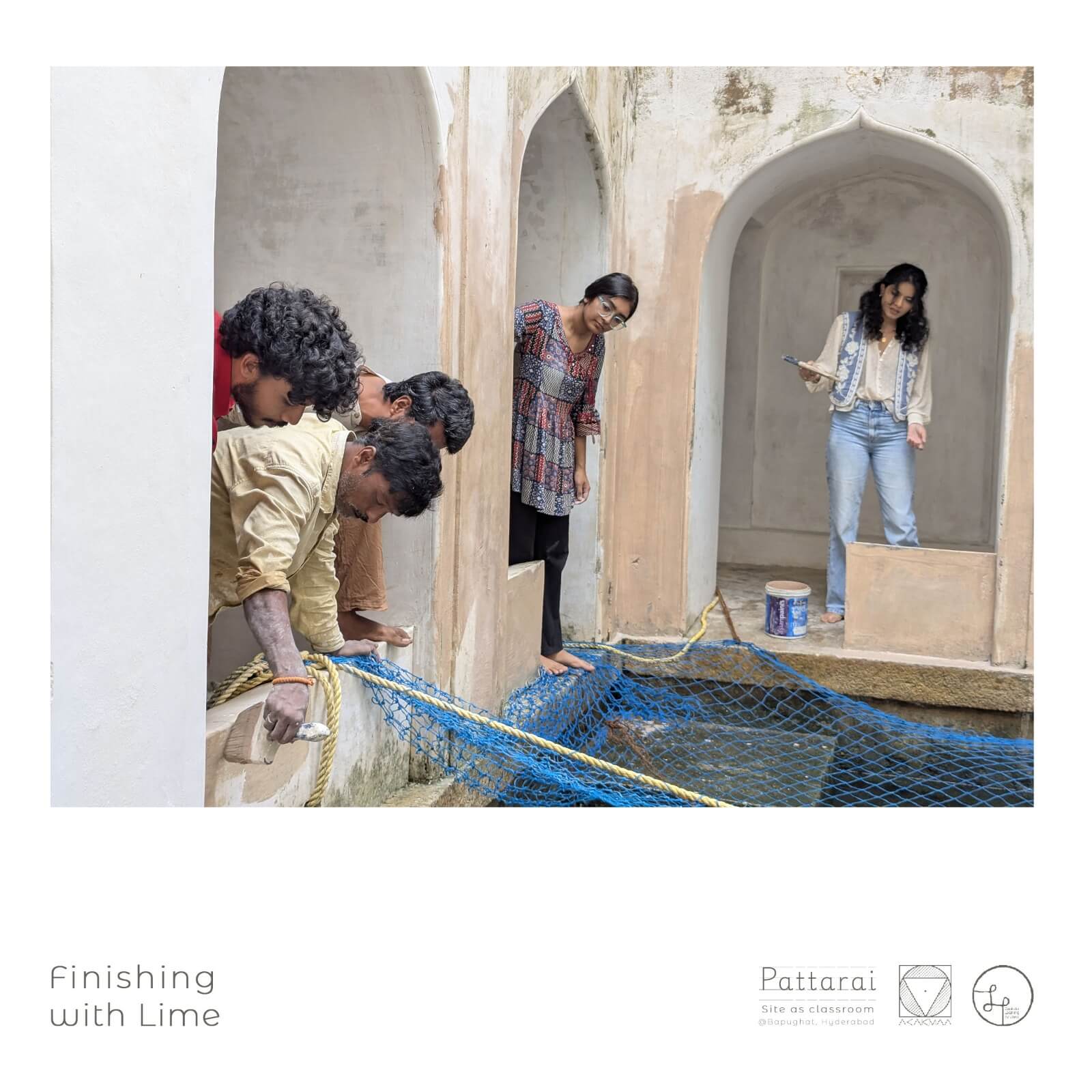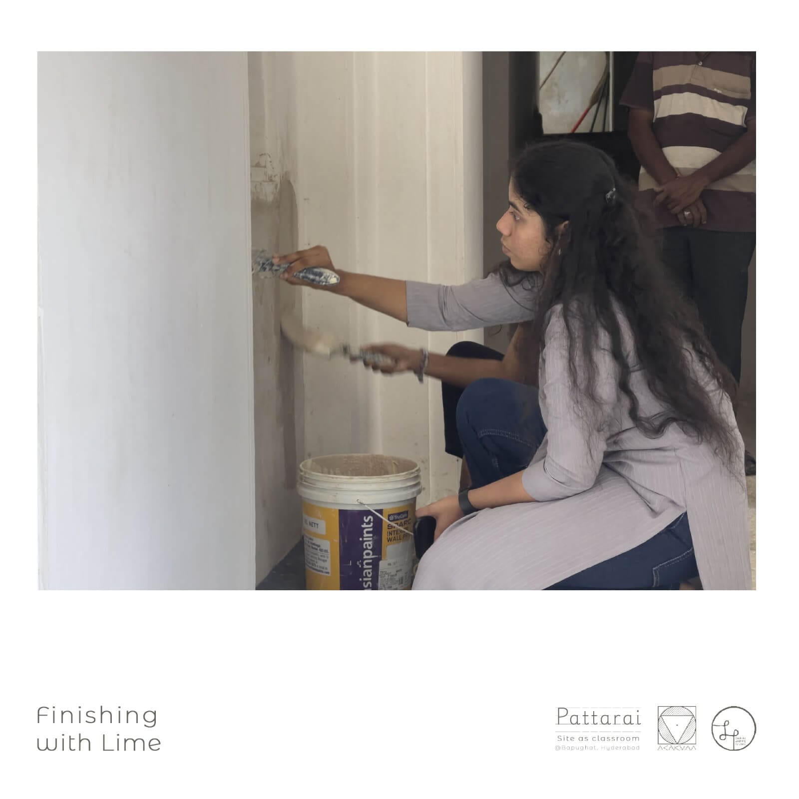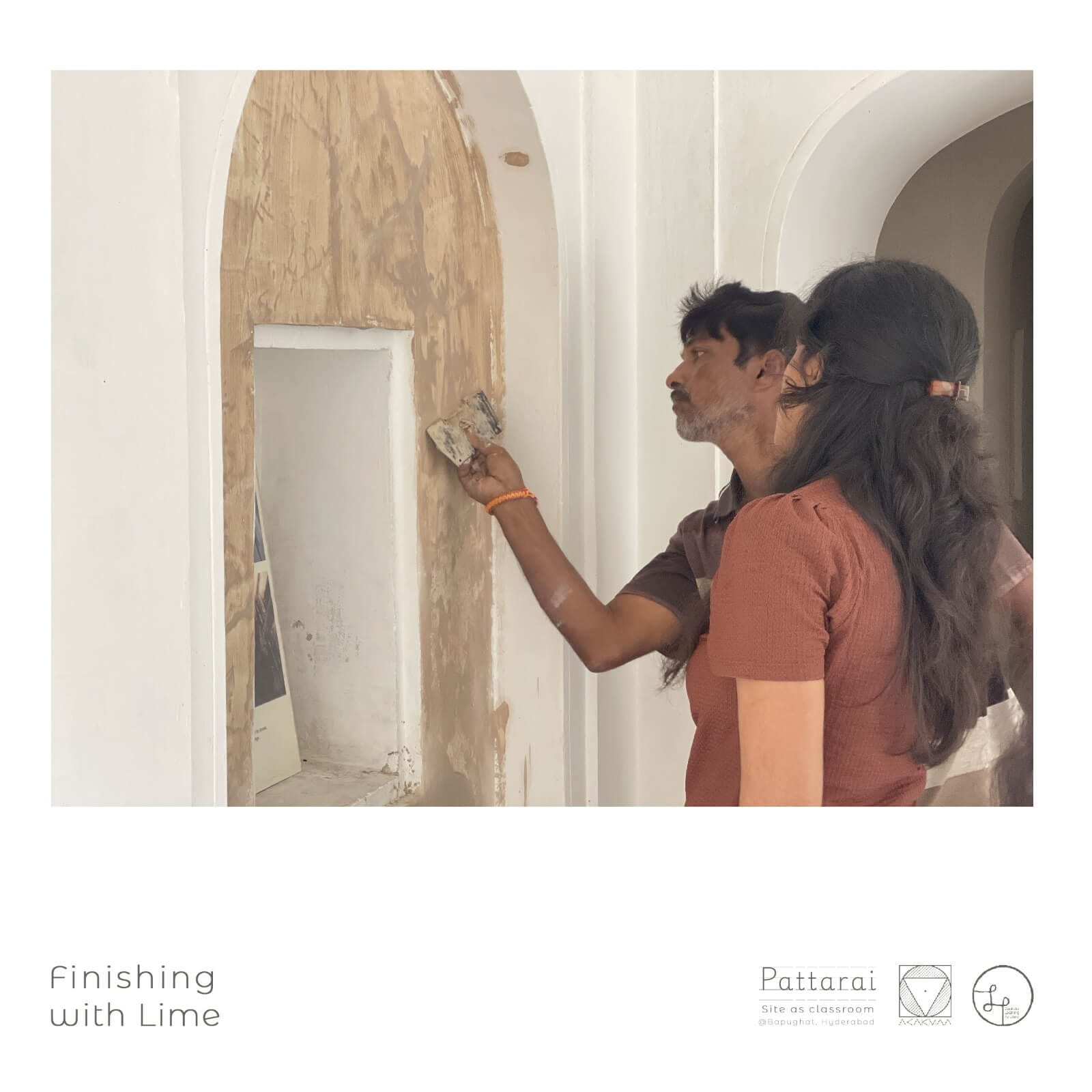The process of using lime as a final coat was discussed. The participants witnessed the mixing of slaked lime with other adhesive materials in their respective proportions. “It’s very interesting to see how natural material like kadukkai can add such pigment to the lime,” said one of the participants.
