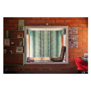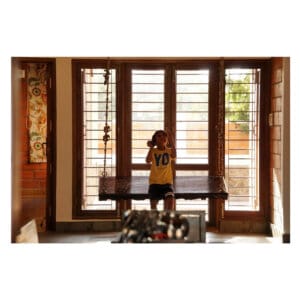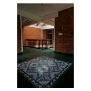 As we walk through every space, our eyes and feet are greeted by a variety of patterns and textures on the ground- geometrically laid combinations of differently textured Kota stone, and Athangudi tiles playing the raft in a sea of green oxide.