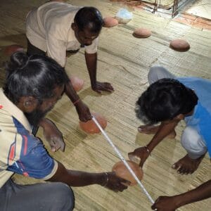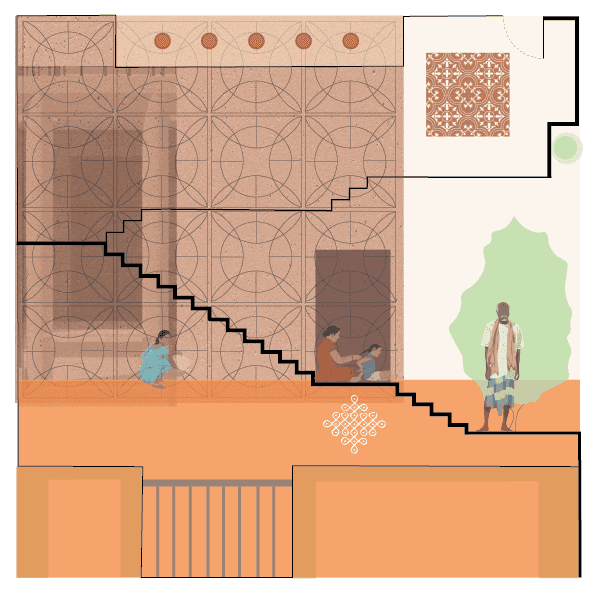 In one of lectures, Prof. Chhaya says ‘architecture should be humane’. We felt that we understood them as words and needed more understanding at an experiential level. When we started the design of the residence at Kulithalai,a suburb of Tirchy, we had a lot of discussions in the studio regarding their lifestyle, their aspirations, their work, their exposure. Discussions let us to explore how they would respond to spaces designed, and what kind of materials are easily available to them, and everything under budget. The design process continued with understanding the site and context. Consideration of different activities throughout the day guided creation of different spaces and their connections within the house; and again everything in accordance to the local belief systems. The space of the thinnai (front verandah) was perceived in many ways. We imagined the client opening the kitchen windows, brewing coffee, choosing vegetables to chop, getting outside the house, sitting on a stone slab, setting the veggies, stretching their legs, leaning against the wall, enjoying fresh filter coffee while preparing for the day’s activities.