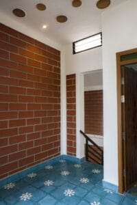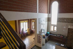 Abutting this linear arrangement of spaces is a one-and-three-quarters high grey-toned dining and kitchen with a stairway leading upstairs. The tall arched window that filled the kitchen with light. Multiple rounds of coffee were made and rellished on the in-built seating in the living room and on the terrace. With parapets designed with a play of bricks and jalis with stone slabs laid as handrails, the terrace designed as a space for having conversations over tea amidst potted flowering plants and winged visitors, befittingly served its purpose. The house’s small footprint is rendered invisible through varying volumes enclosed within mud blocks, terracotta jalis, various designs of filler slabs and contrasted by colourful athangudi tiles.