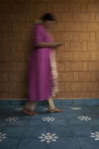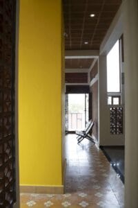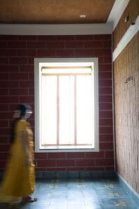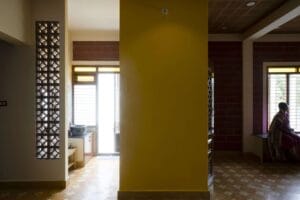 ‘I wore a yellow dress to match the floor colour !” said the client, as she walked out of the bedroom; we found her partner, seated on the stone ledge in the far corner of the thinnai, deeply occupied with his phone. When called for a photograph, both of them unanimously took to their preferred activities in the house, a photograph we will cherish. Sree Nivasam is a cozy home with an interplay of tiny and large spaces, designated to suit the different needs of the family members. A small enclosed thinnai (verandah) space, takes one through an enclosure to a bright yellow living room that also transforms into a place for extended puja gatherings. Behind this is a personal niche for grooming, washing and a way out for drying. As one walks further, there are two bedrooms with calculated openings for cross-ventilation.