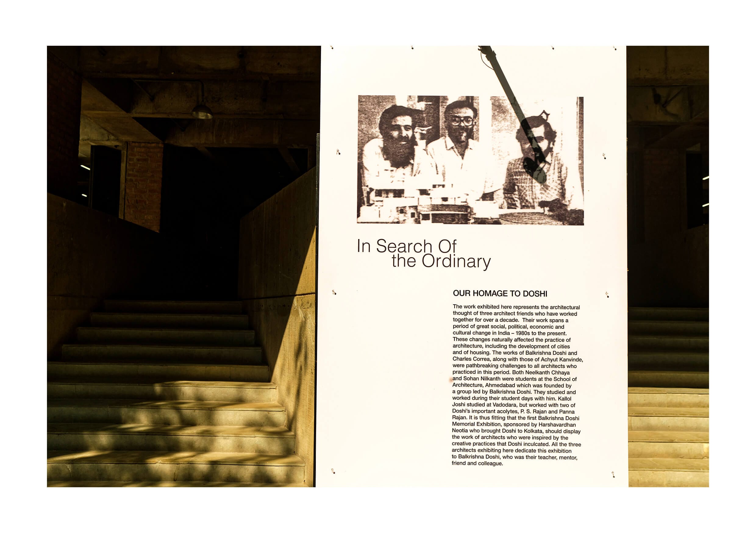 These changes naturally affected the practice of architecture, including the development of cities and of housing. The works of Balkrishna Doshi and Charles Correa, along with those of Achyut Kanvinde, were pathbreaking challenges to all architects who practised in this period. Both Neelkanth Chhaya and Sohan Nilkanth were students at the School of Architecture, Ahmedabad which was founded by a group led by Balkrishna Doshi. They studied and worked during their student days with him. Kallol Joshi studied at Vadodara but worked with two of Doshi’s important acolytes, P. S. Rajan and Panna Rajan. It is thus fitting that the first Balkrishna Doshi Memorial Exhibition, sponsored by Harshavardhan Neotia who brought Doshi to Kolkata, should display the work of architects who were inspired by the creative practices that Doshi inculcated. All the three architects exhibiting here dedicate this exhibition to Balkrishna Doshi, who was their teacher, mentor, friend and colleague”. (Source: Exhibition panel)