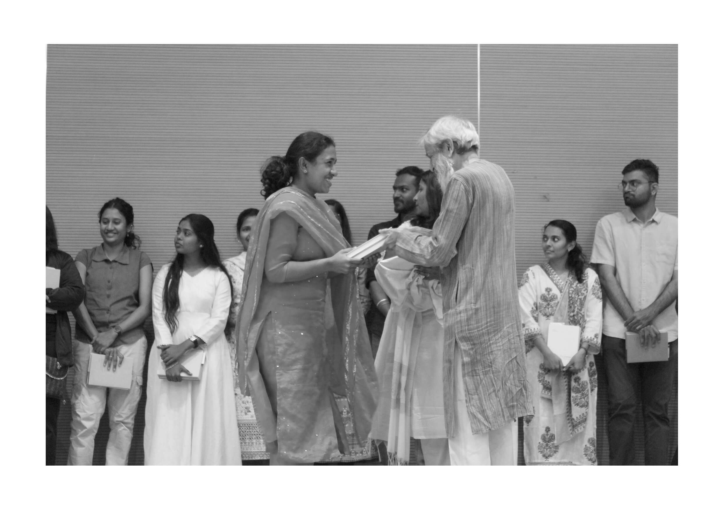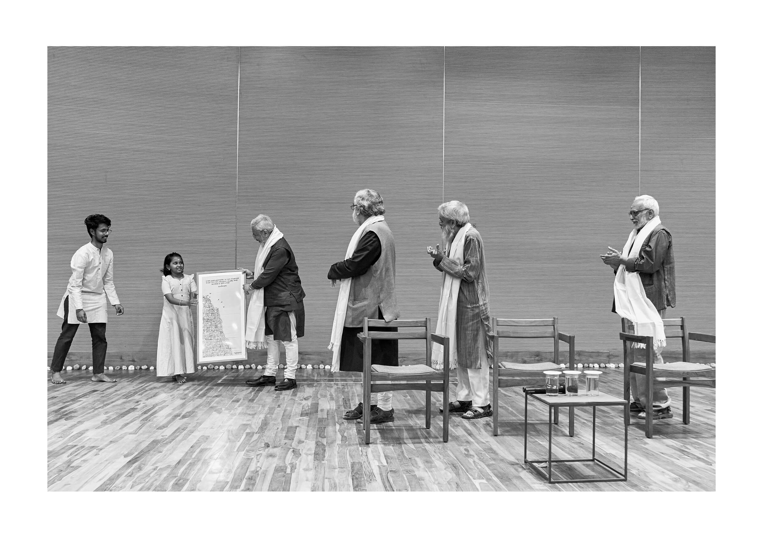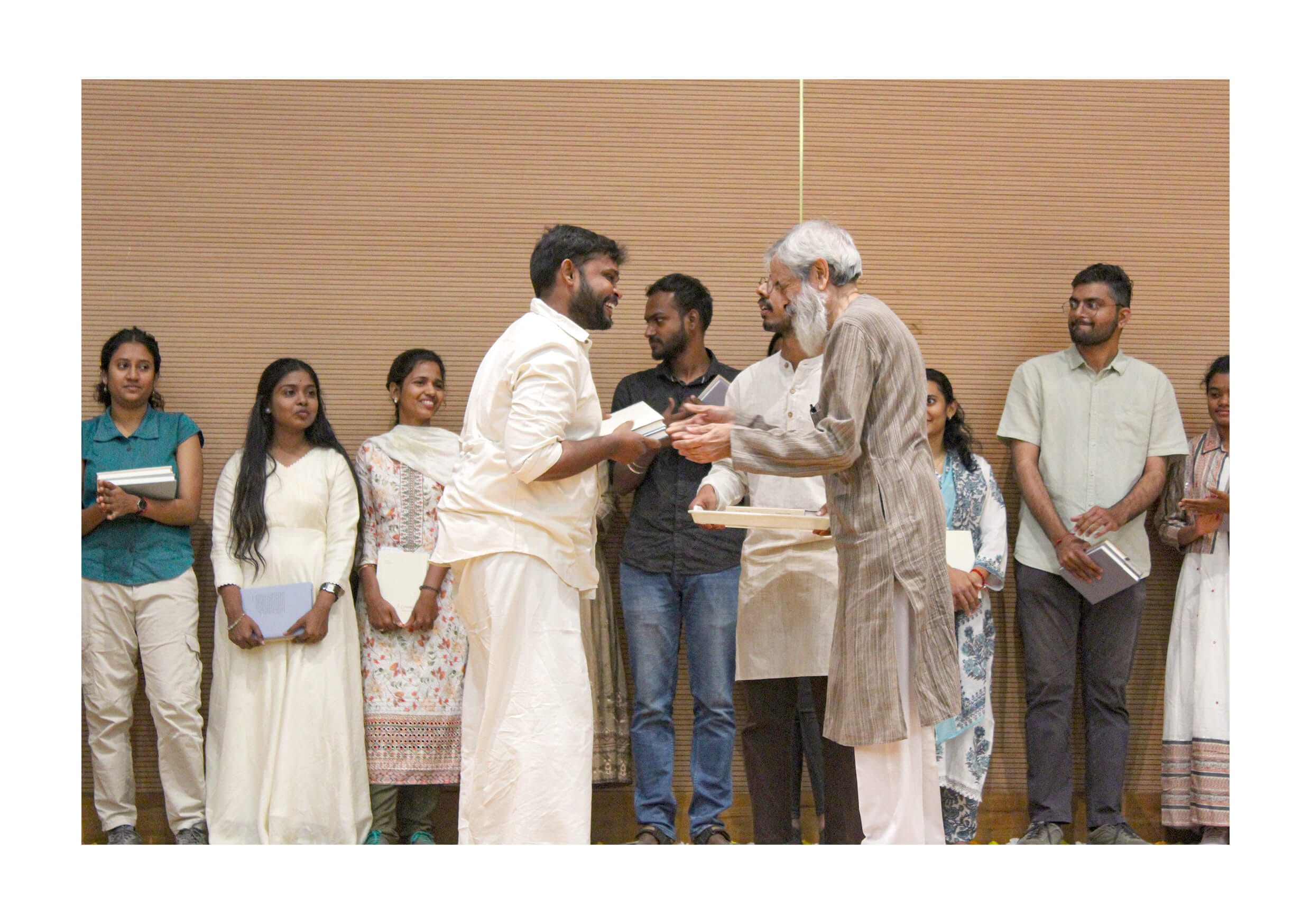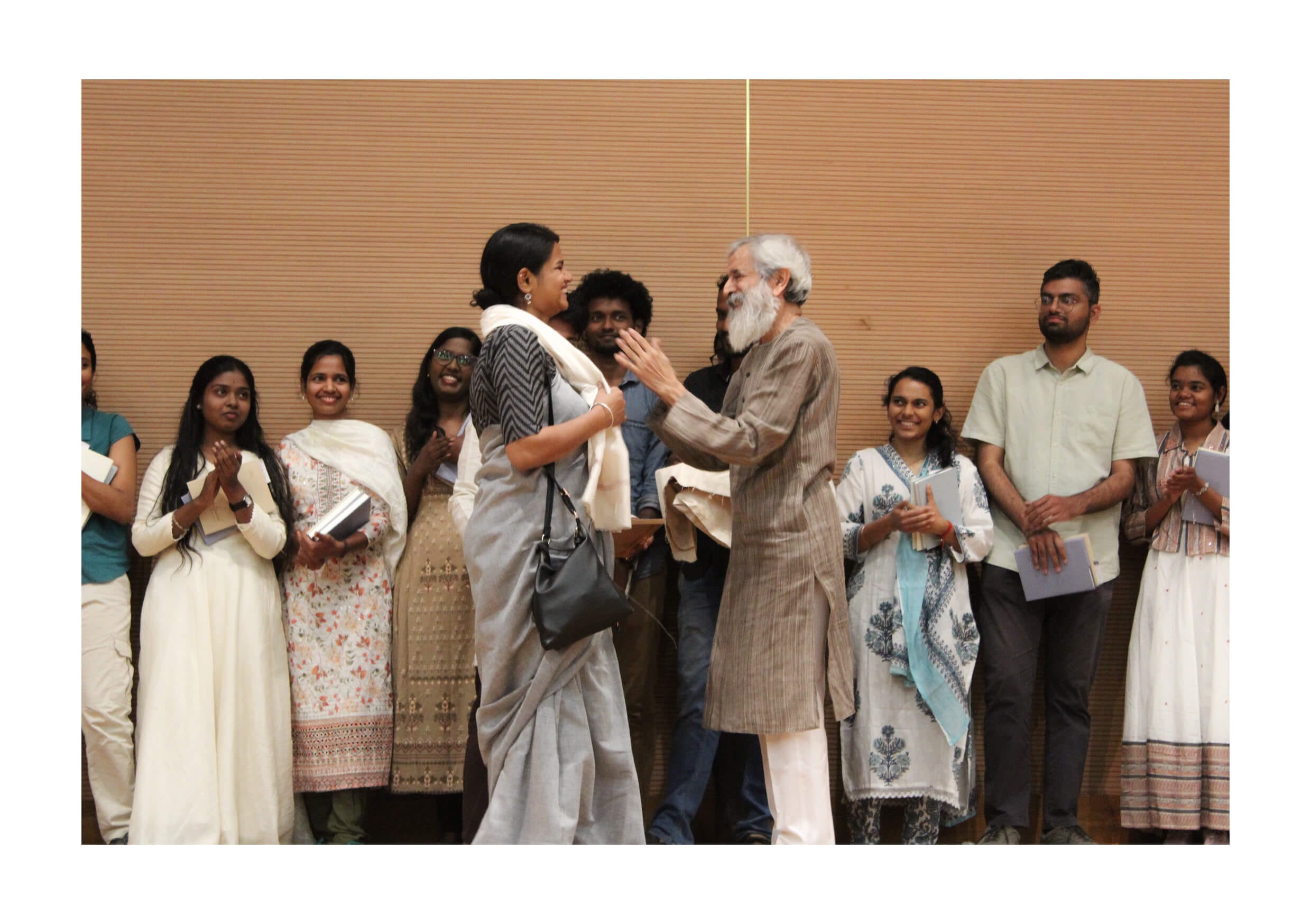 Karthikey Sarabhai shared his experience of working with Mandala Design Services and mentioned moments that were close to his heart, which showcased the integrity of their practice. He appreciated that their practice gave importance to large-scale details to small-scale details; from responding to contours to designing the door handles. He specifically commended their ability to address both the site and the user in a compassionate way, stating examples. He then felicitated the three partners of Mandala Design Services and later he was felicitated by Puviyazh from Nurpu Handlooms.