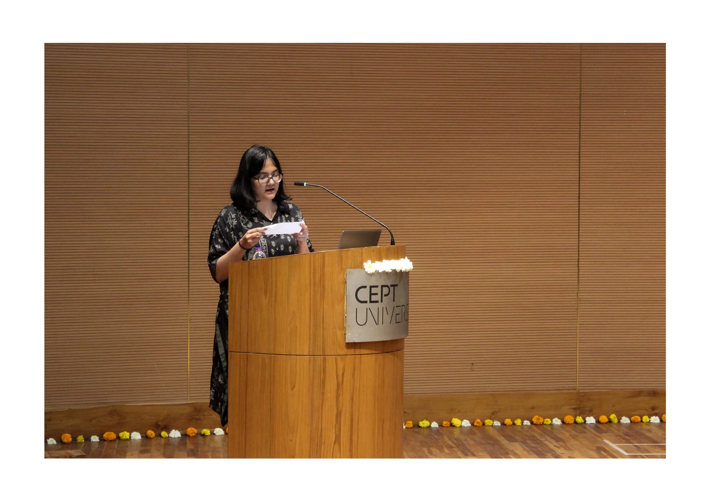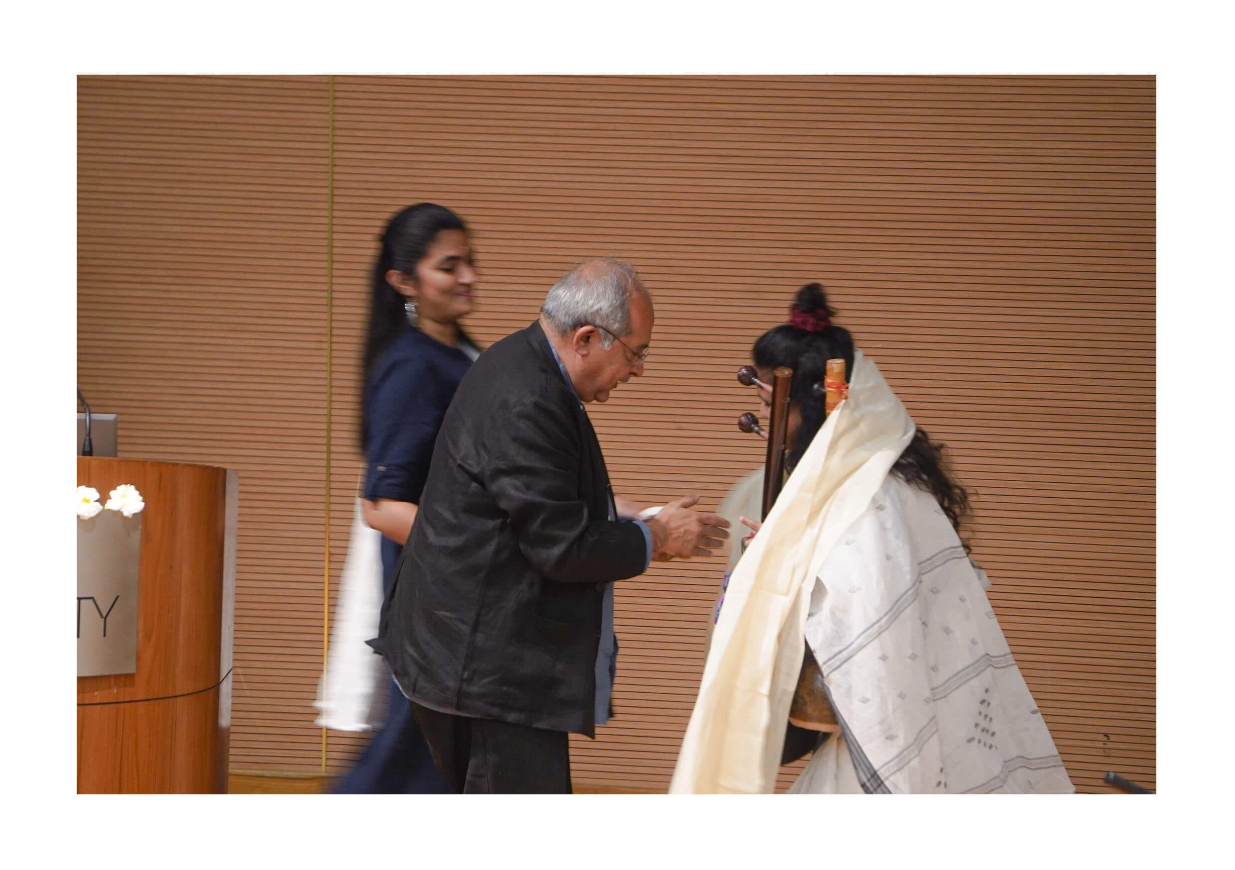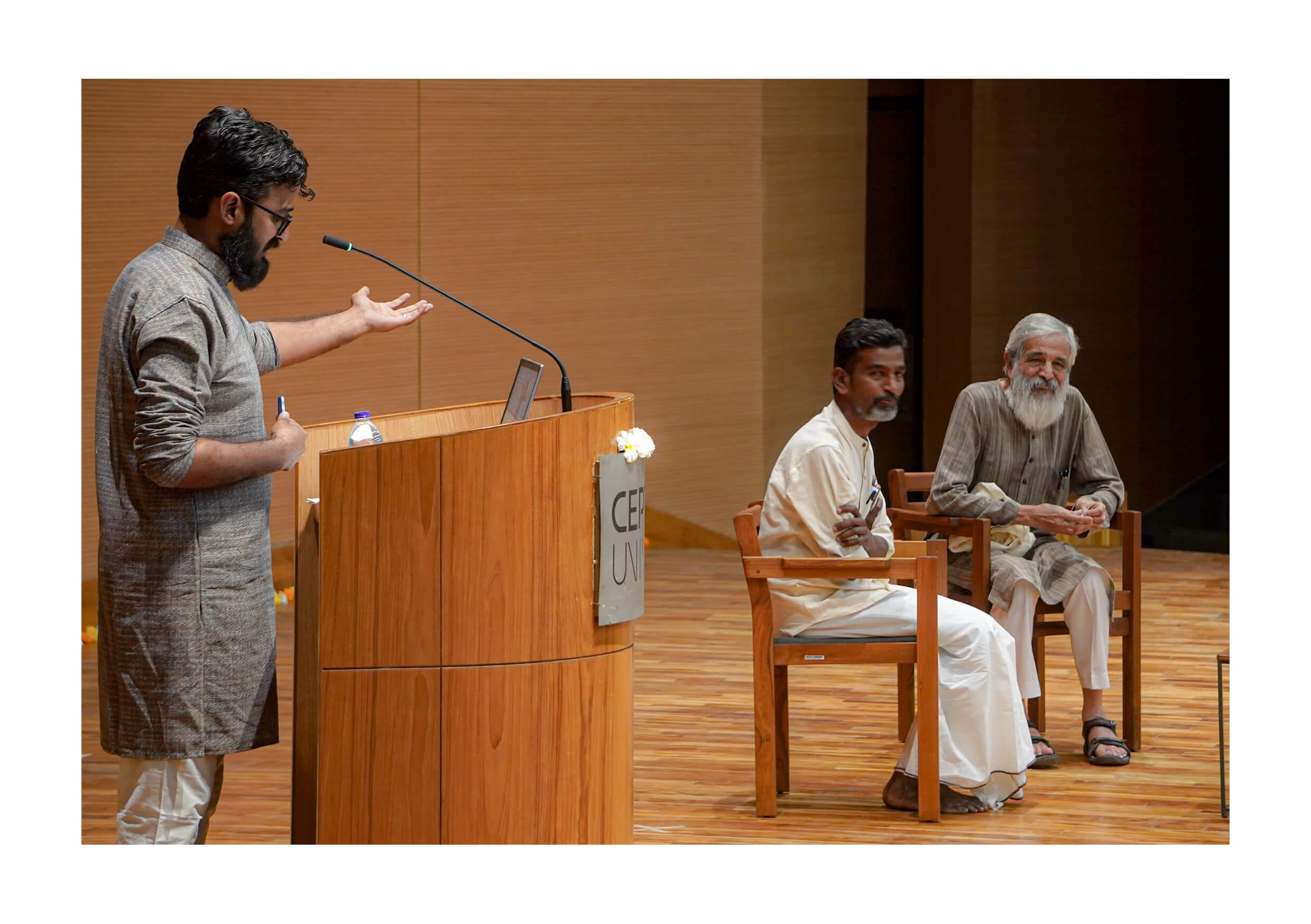 Sahajo Sang, an initiative of music through which various lives have been touched, documenting and archiving different folk songs, traditions and folk instruments across India. Founded by Tejashree Ingawala, a disciple of renowned Parvathy Baul, who also has a very unique way of practice, where she heals through prayer fasting and singing, setting the grounding tone for the evening through divine invocation. Her voice echoed in the hall as well in everyone’s hearts. Prof. Tridip Suhrud, Provost of CEPT University felicitated her.