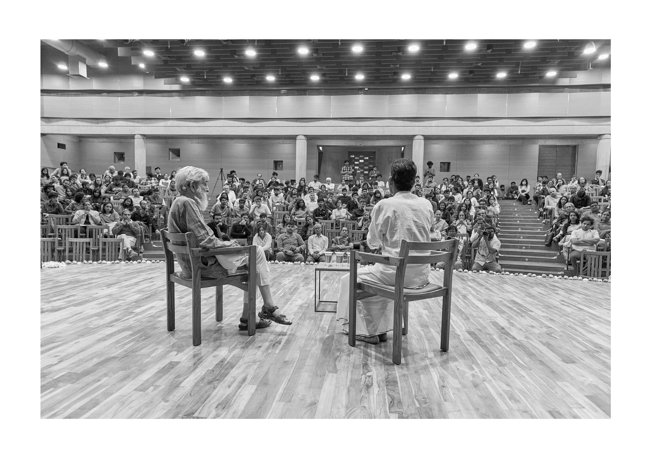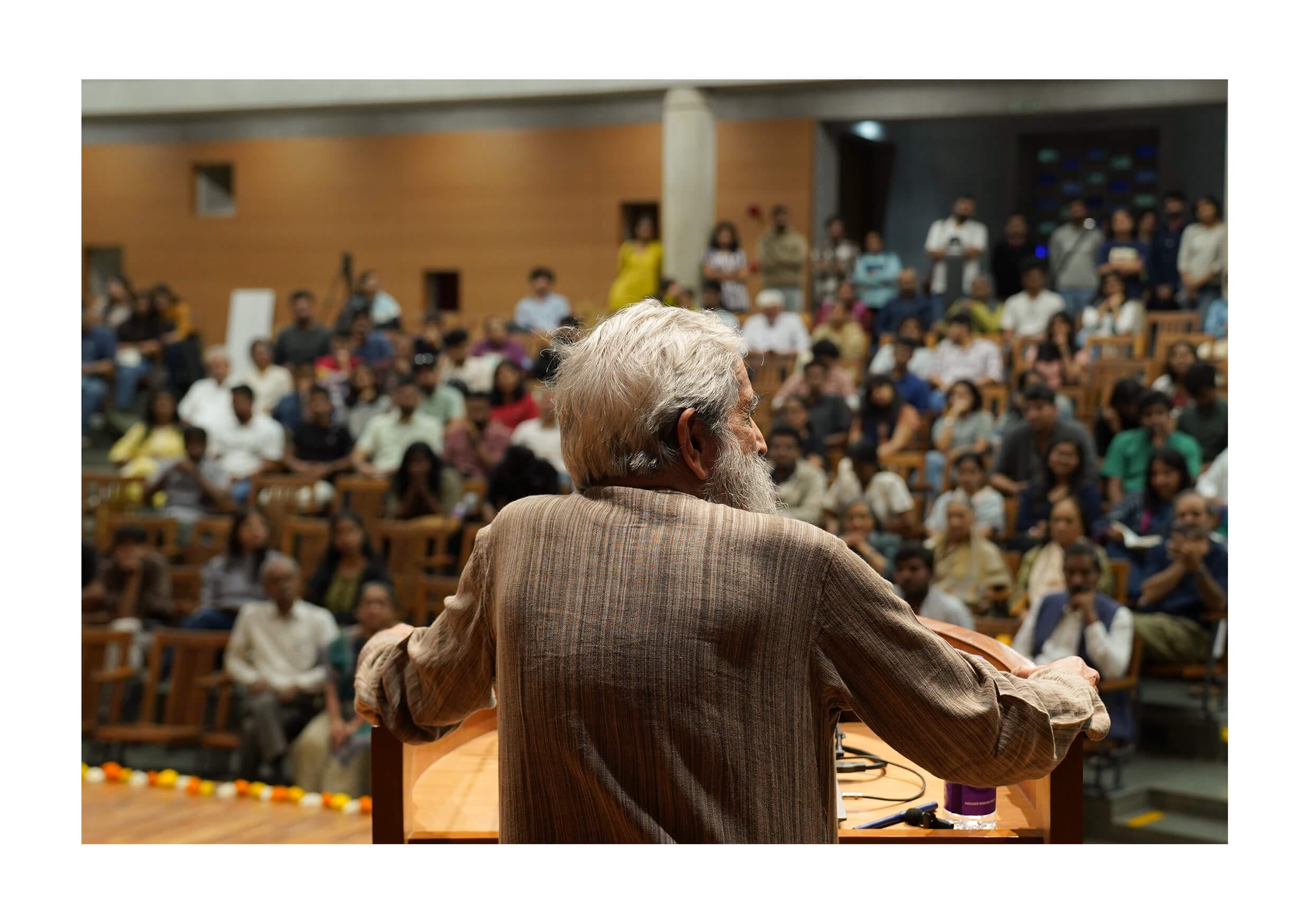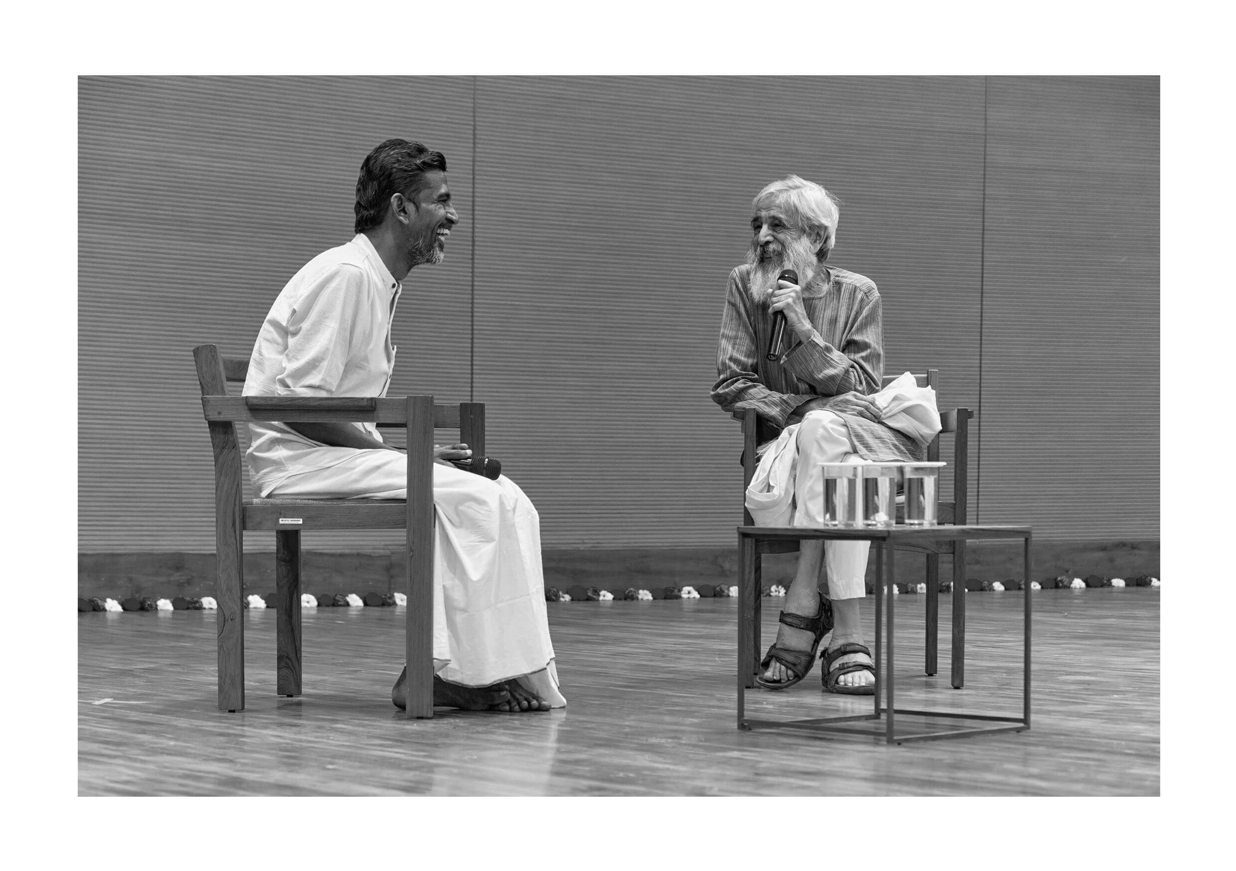 Sivaraj, fondly known as Sivanna, the founder of Cuckoo Forest School, a space of learning for all groups, especially for children, based on the principles of Nai Talim. The conversation started with the remembrance of Prof. Chhaya’s mother, the learnings from his mother that he carries forward. Sivanna then shared the story of Krishnammal Jagannathan, who walked the length and breadth of India along with Acharya Vinoba Bhave in the Bhoodan Movement. She, who is turning a hundred years old soon, still wishes to build 6000 houses for the fishermen of Thiruvarur. He then remembered Nigamananda, who fasted to clean the Ganga and sacrificed his life on the 116th day of fasting without food and water. Through this he asked on how and why Prof. Chhaya believes in the ‘Architecture of Ahimsa’ amidst the globalisation and institutionalisation in the world. Metaphorically Sivanna compared this to walking with a small candle through the cyclone. Prof. Chhaya responded that one shouldn’t be afraid of being small and should still continue to be without thinking beyond. He then mentioned the difference between one wanting to change everything and changing oneself, which is missing in the architects of the present generation.
