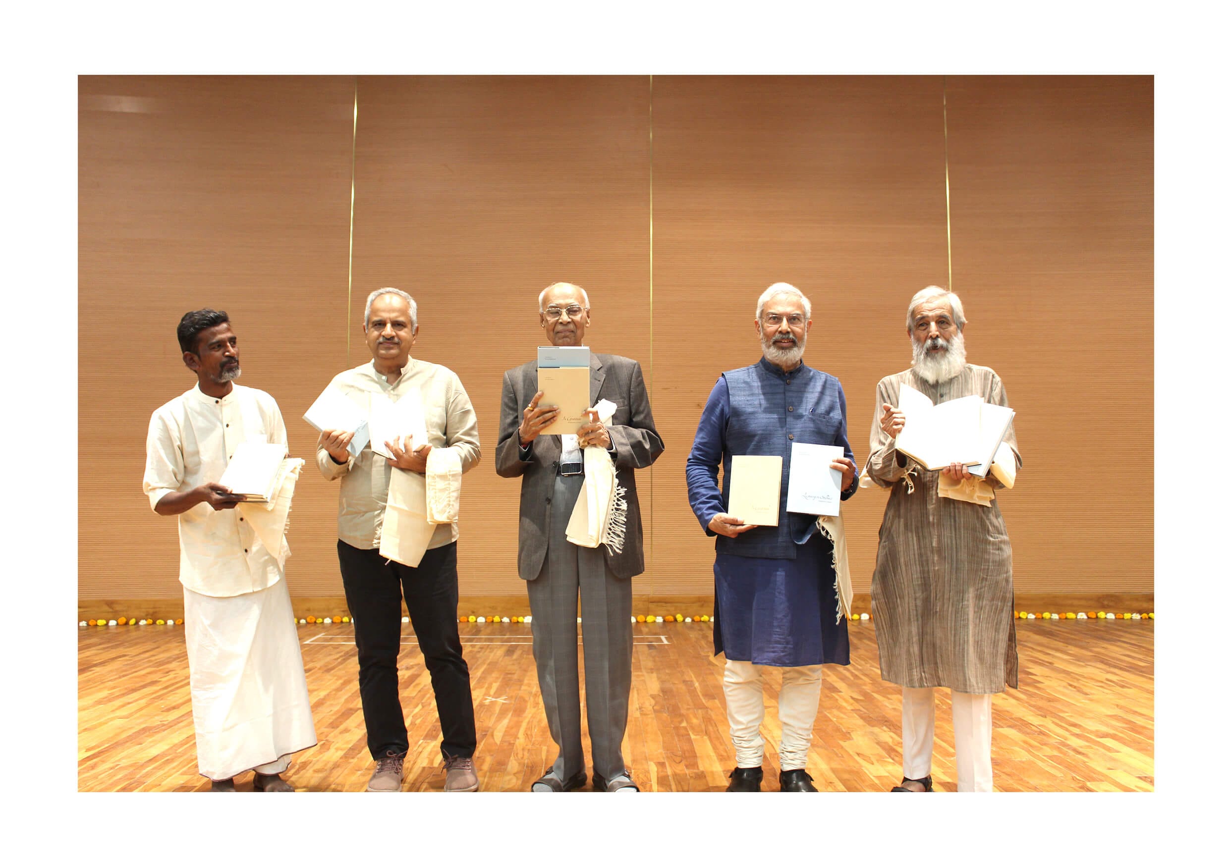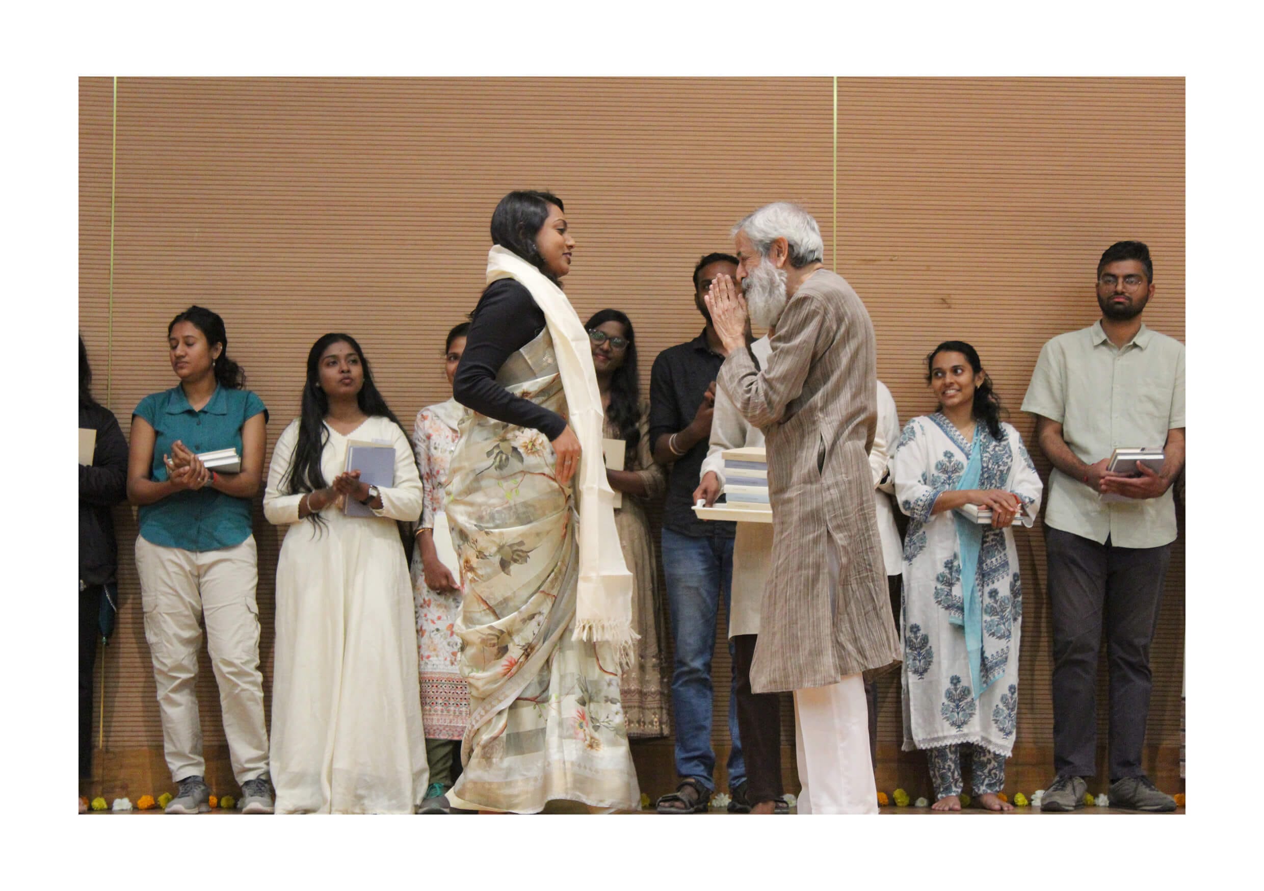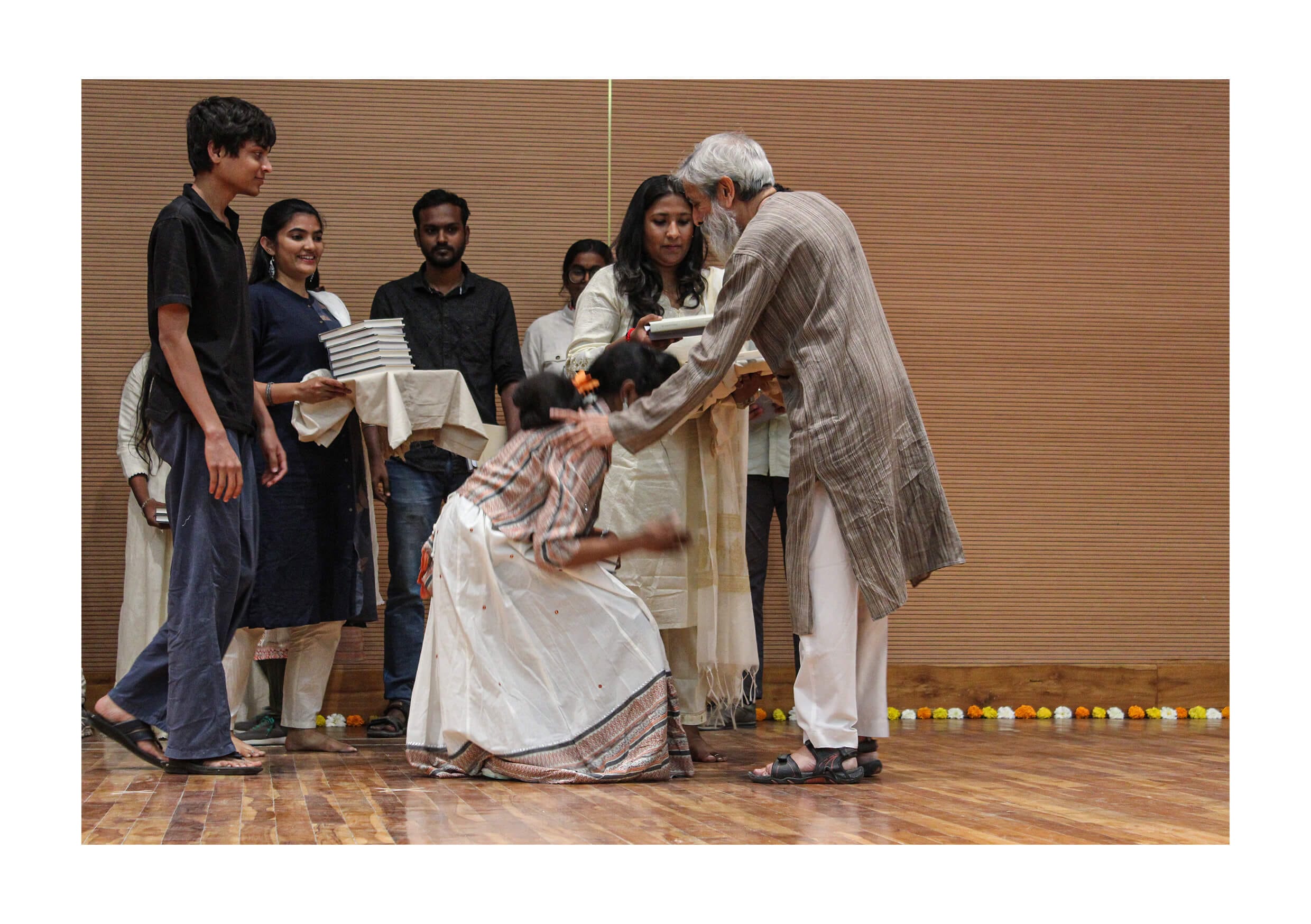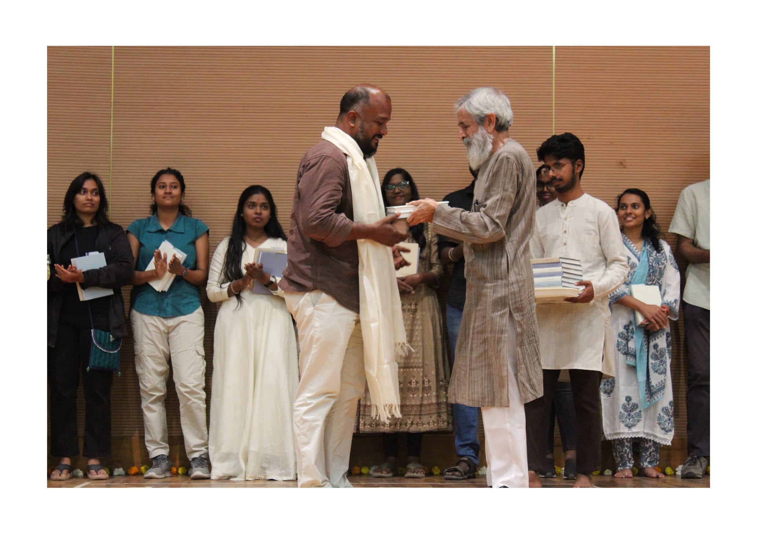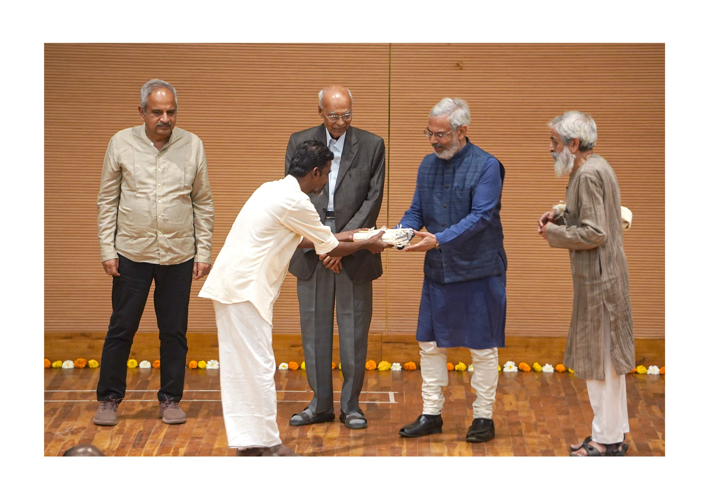 Sivanna shared about the pedagogy of Cuckoo Forest School, a community for children at the foothills of Javadhu Hills. He said that the child coming from the land may not necessarily become a doctor or an engineer but definitely would become someone who would be able to take a mug of water from the drainage and water the plants nearby. Sivanna expressed his gratitude for the opportunity to be in the presence of a master like Prof. Chhaya. The conversation ended with Prof. Chhaya felicitating Sivanna.