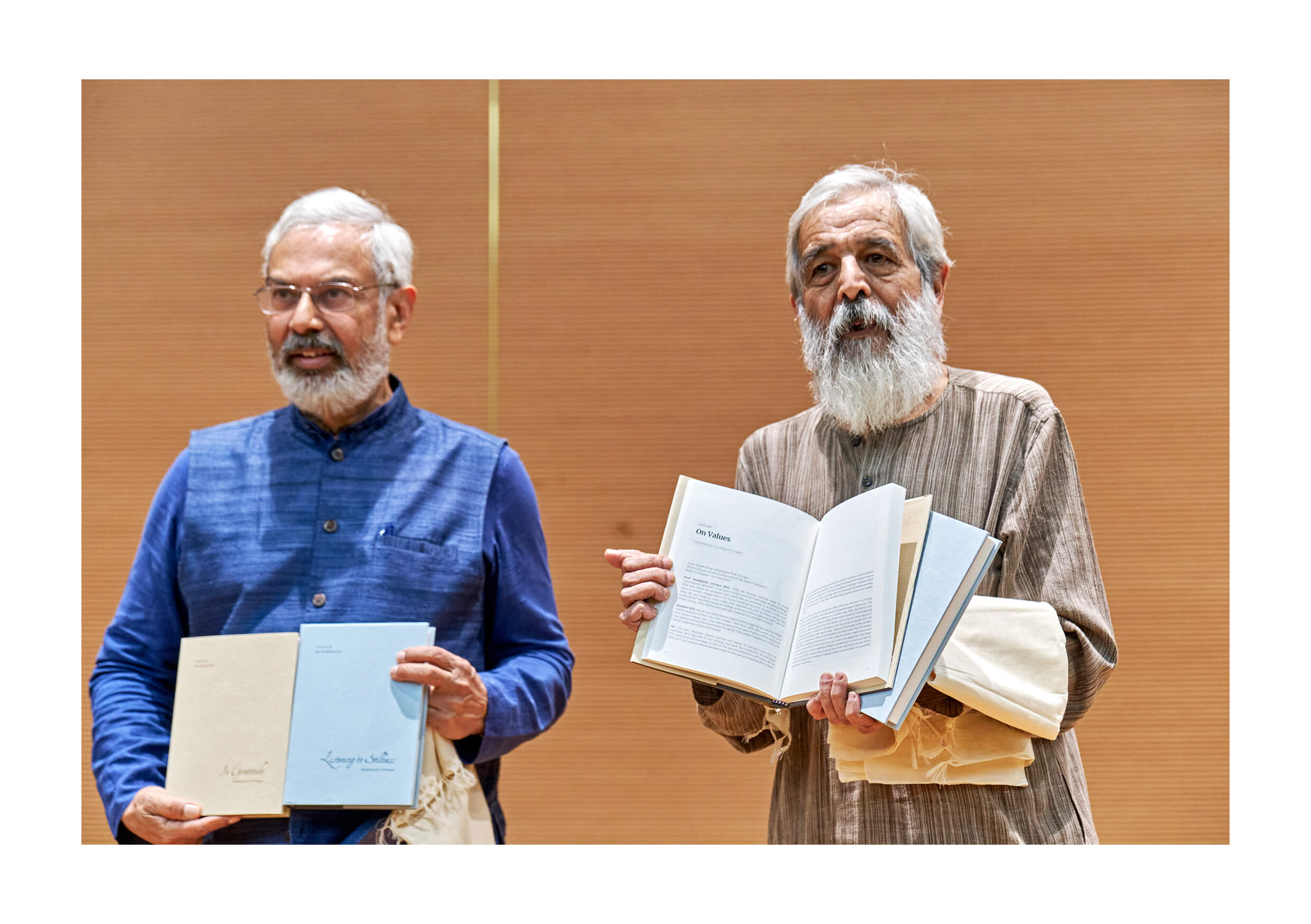 Now, may I request Prof. RJ Shah, Mr. Karthikeya Sarabhai, Ms. Anu Ben and Ar. Pradeep Makhejani to join Prof. Chhaya and Sivaraj on stage to release the book”.